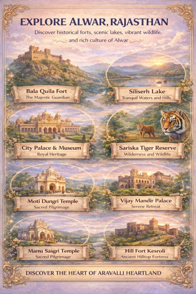Nestled between the ancient Aravalli hills, Alwar is a city where spirituality, history, and royal heritage come together in perfect harmony. Known for its magnificent temples, sacred sites, and centuries-old traditions, Alwar reflects the deep cultural and spiritual roots of Rajasthan. From the divine serenity of Pandupol Hanuman Temple to the revered Neelkanth Mahadev Temple, the city offers a peaceful retreat for devotees and travelers alike. Beyond its spiritual aura, Alwar is adorned with grand forts, majestic palaces, and vibrant local culture that echo the glory of Rajputana. Every stone, shrine, and street here tells a story of faith, devotion, and timeless heritage, making Alwar not just a destination, but a soulful experience.Alwar, set in the Aravalli hills, is a city rich in spirituality, heritage, and royal history. With sacred temples, historic forts, and deep-rooted traditions, it stands as a symbol of Rajasthan’s divine and cultural legacy. The city offers visitors a unique blend of devotion, peace, and architectural grandeur.Alwar stands as a timeless symbol of devotion, heritage, and royal legacy in the vibrant state of Rajasthan. Cradled in the ancient Aravalli ranges, this historic city blends spiritual depth with architectural grandeur, offering visitors an experience that touches both the heart and the soul. Known for its sacred temples, serene landscapes, and majestic forts, Alwar carries an atmosphere of peace that sets it apart from the bustle of modern life.Spirituality flows through the very air of Alwar. The city is home to revered temples that draw devotees from across the country. The Pandupol Hanuman Temple, located deep within lush greenery, is believed to be connected to the epic Mahabharata and is a place of immense devotion. The ancient Neelkanth Mahadev Temple, with its intricate carvings and historical importance, reflects the artistic brilliance and spiritual dedication of earlier civilizations. These sacred sites are not just places of worship but centers of faith, hope, and inner peace.Alwar’s spiritual identity is beautifully complemented by its royal past. The grand Bala Quila (Alwar Fort) watches over the city.
