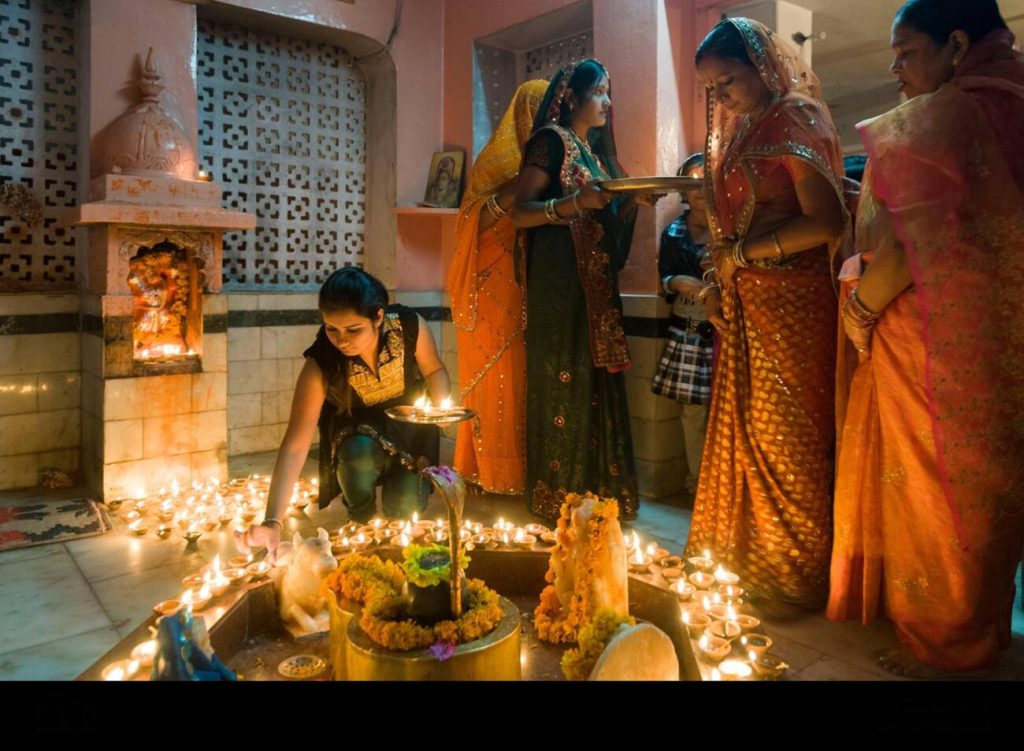 People perform Lakshmi Puja and light diyas in homes and temples.